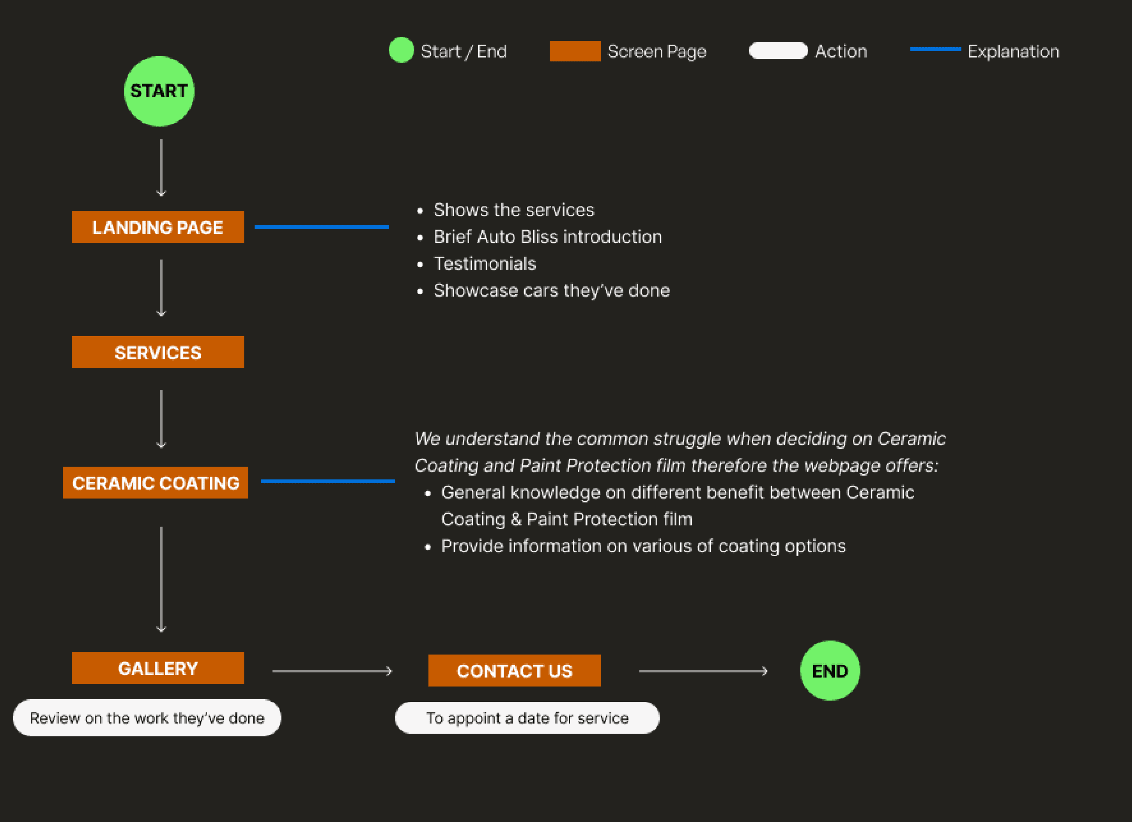 Before designing AutoBliss’s wireframe, I first needed to understand the challenges the owner faced. I discovered that many of his competitors, who offered similar services, had well-structured websites that generated a significant portion of their traffic. Additionally, despite AutoBliss’ high Google rating, potential customers often hesitated to trust the business due to the lack of an online portfolio showcasing previous work.