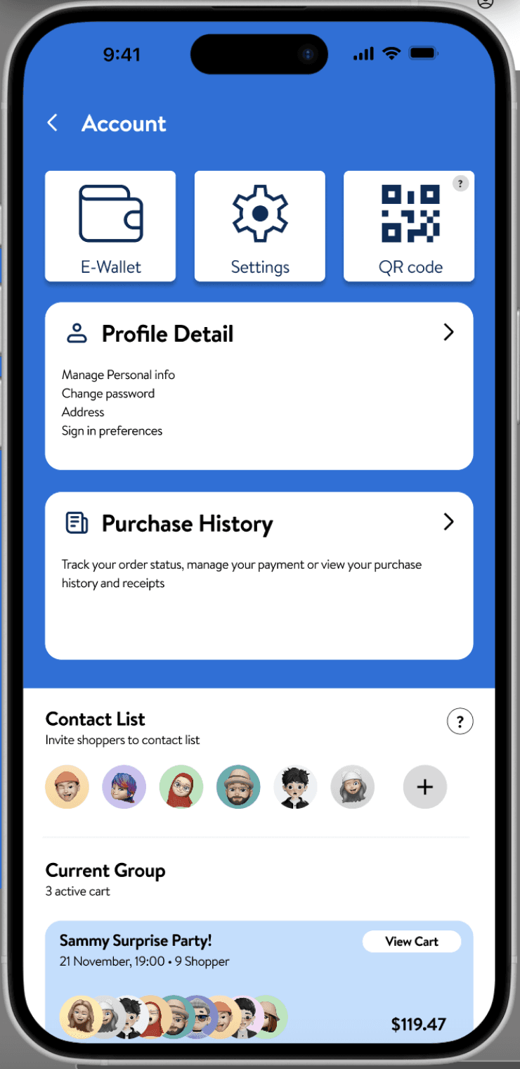 As a result, I strategically designed the app to be user-friendly for both in-person and online shoppers. I decided to implement a QR code feature, enabling users to check out their groceries through the Walmart app even when shopping in-store, this way users are able to use Walmart app as a form of shopping list that has been gathered with other shoppers in the group cart. This enhancement aims to create a seamless shopping experience for all Walmart customers, regardless of their preferred shopping method.